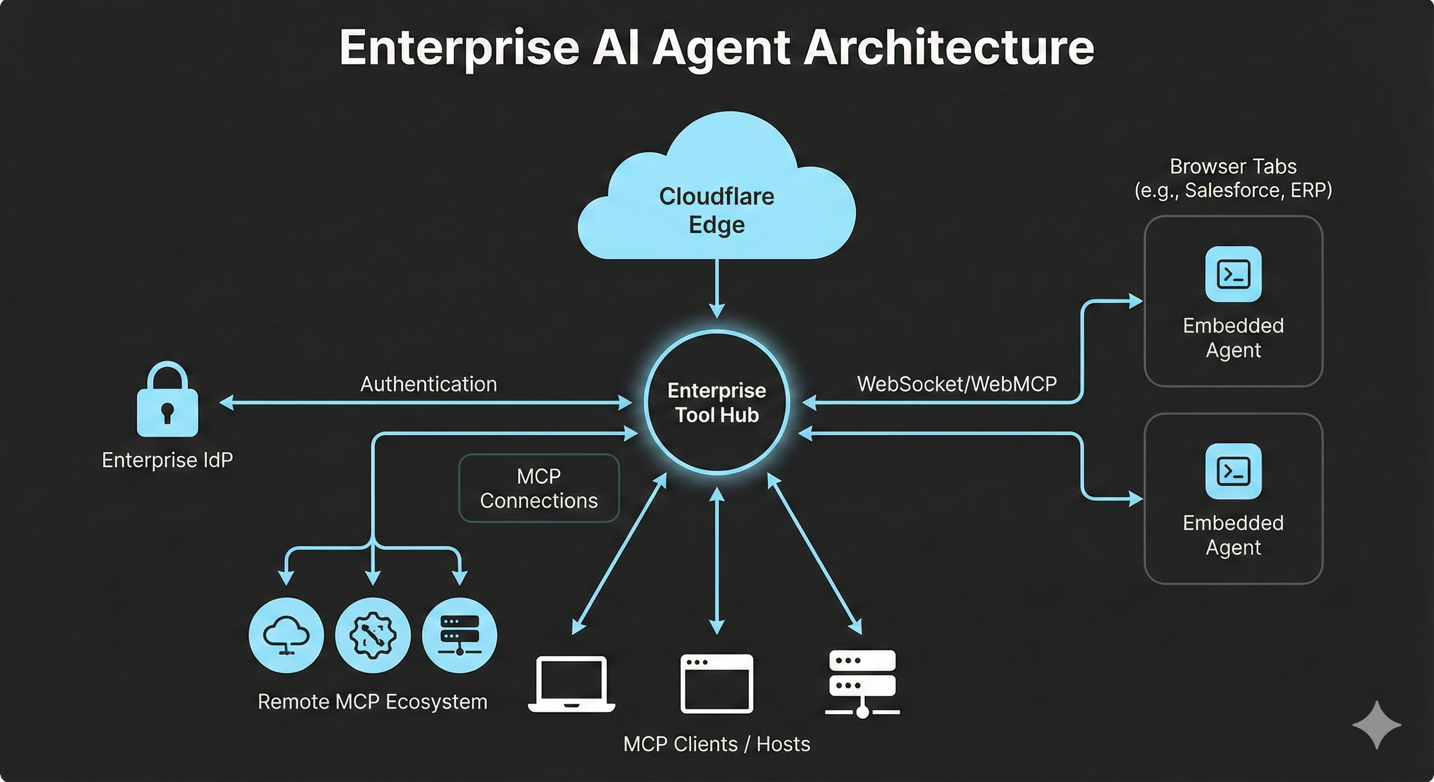 Client Runtime (Session Host): Runs in the browser/WebView. Exposes UI capabilities as tools via WebMCP. Transport-agnostic: postMessage, WebSockets, or SSE.